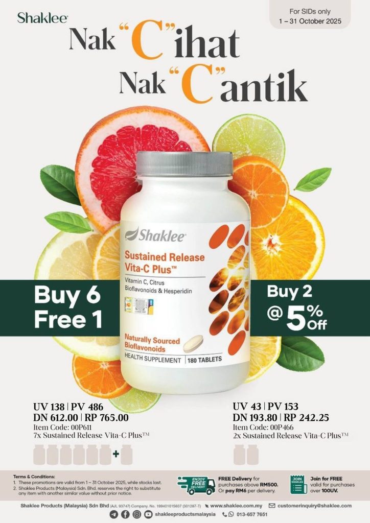 Jadi, jadikan Vitamin C Shaklee teman harian anda, kerana tubuh kita tidak mampu hasilkan Vitamin C sendiri — tapi dengan Vita-C Shaklee, anda sentiasa dilindungi dan bertenaga sepanjang hari.
